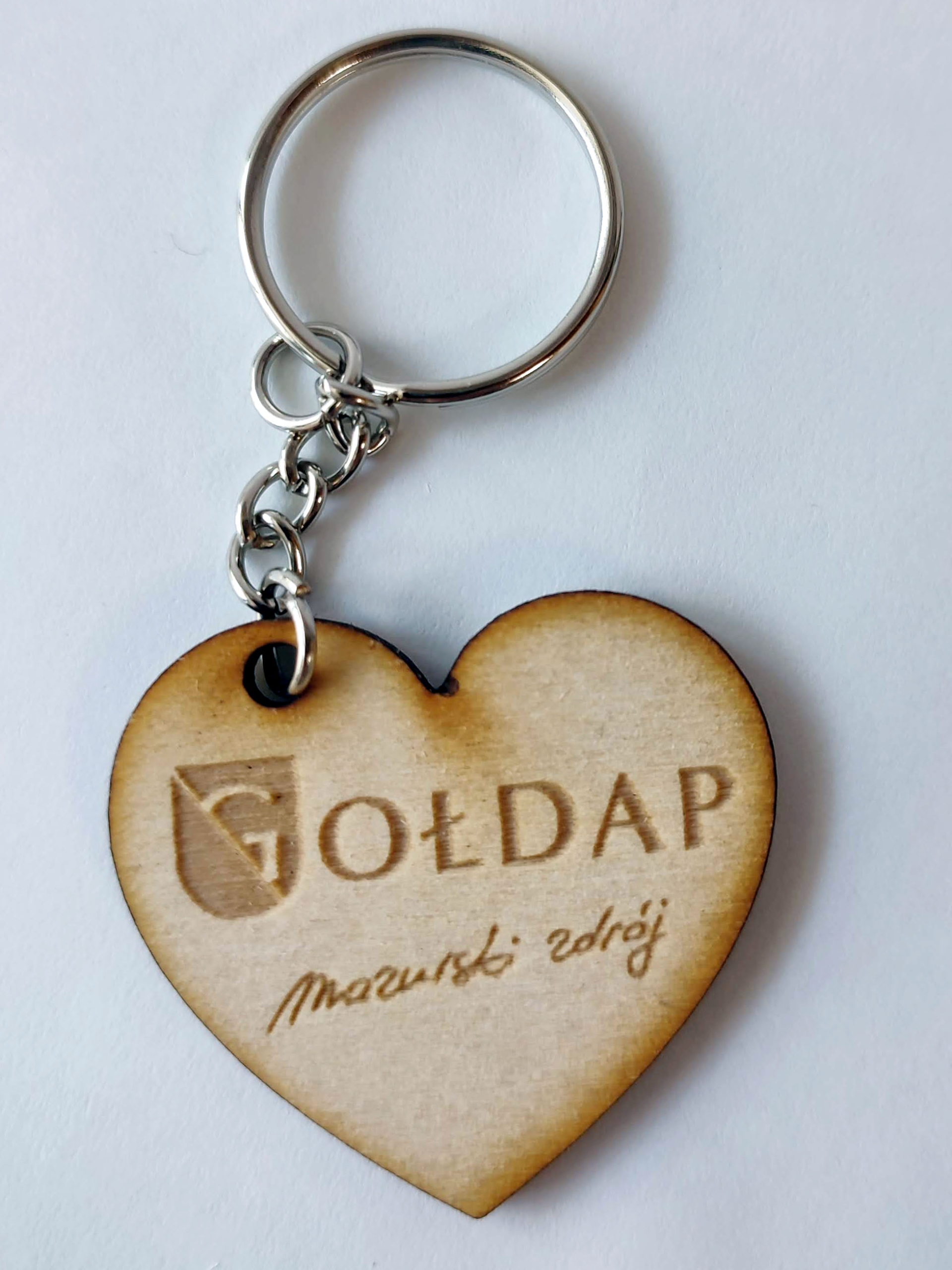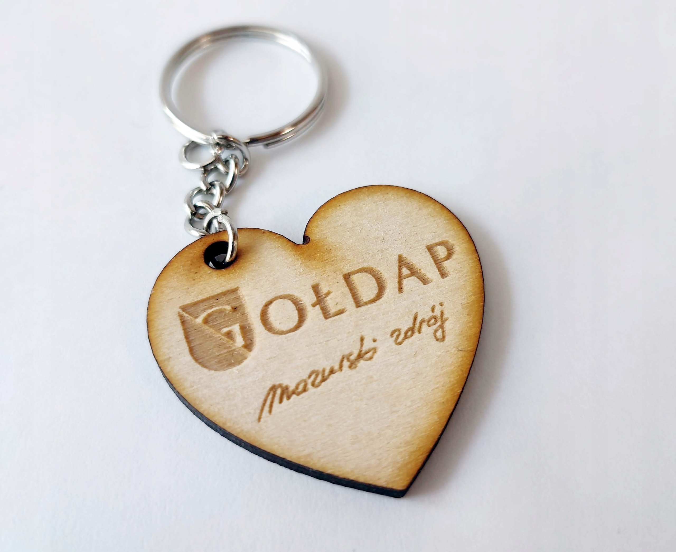 Brelok drewniany z logo Gołdap – Mazurski Zdrój wykonany przez pracowników naszego przedsiębiorstwa społecznego.