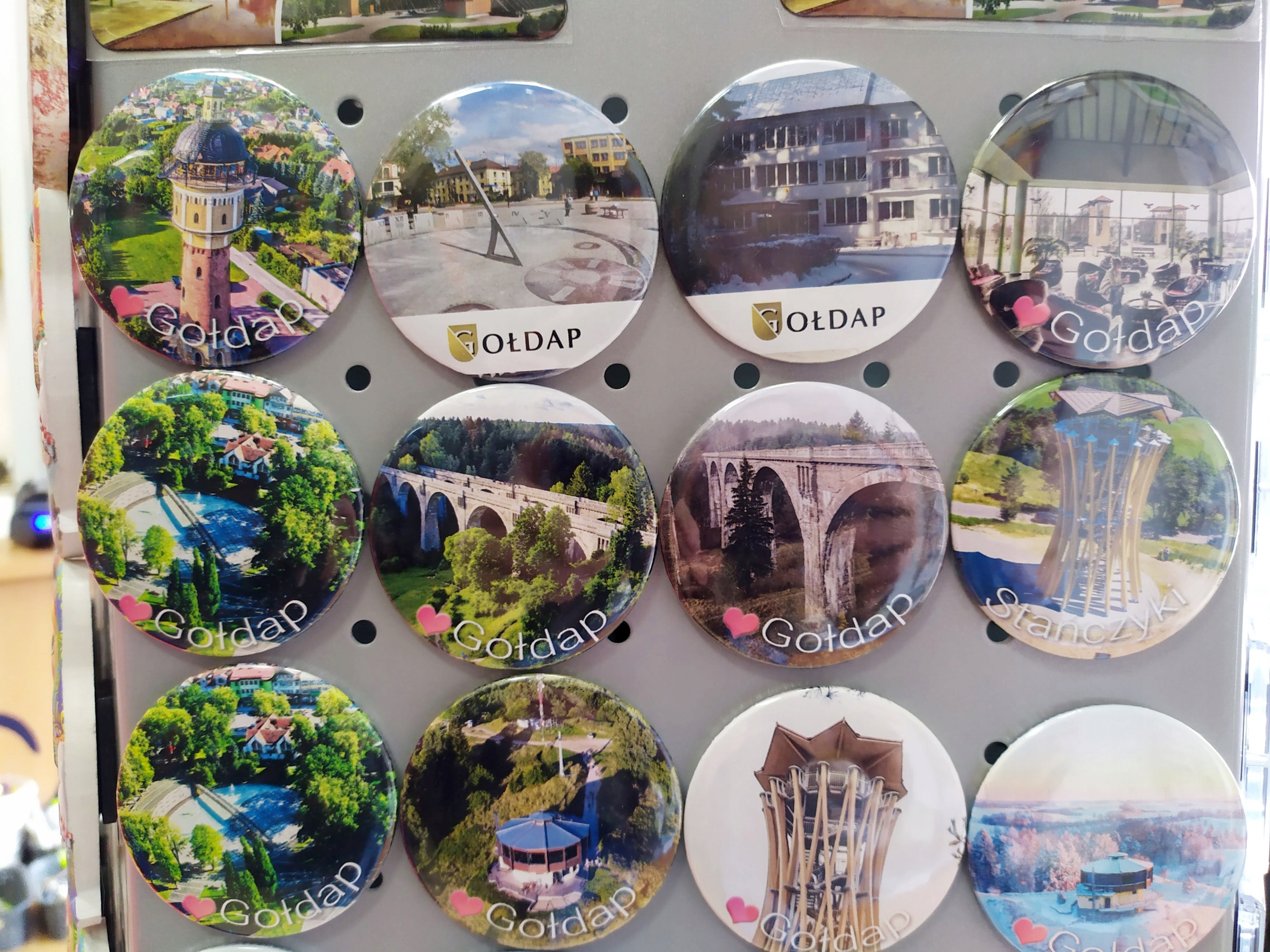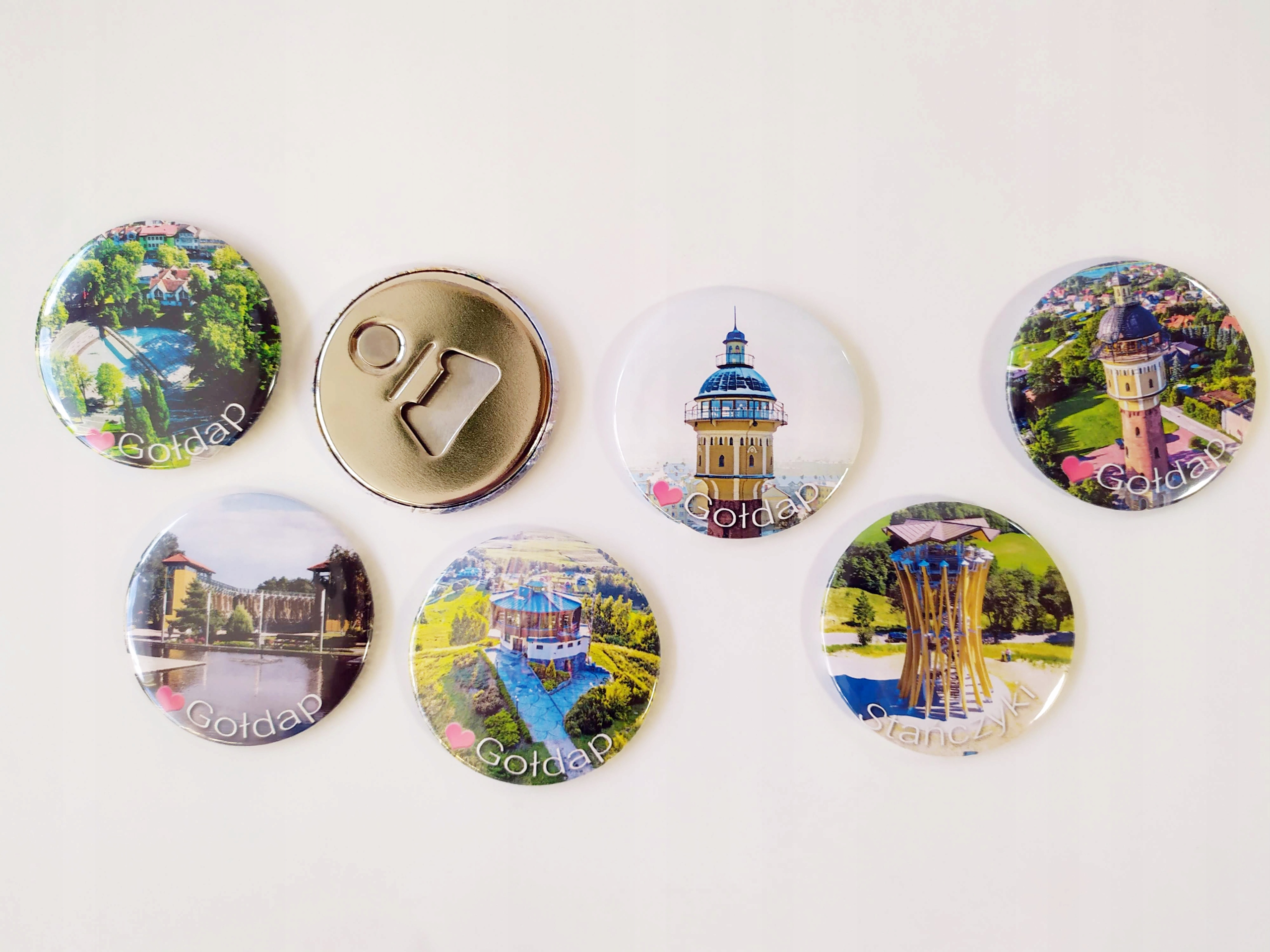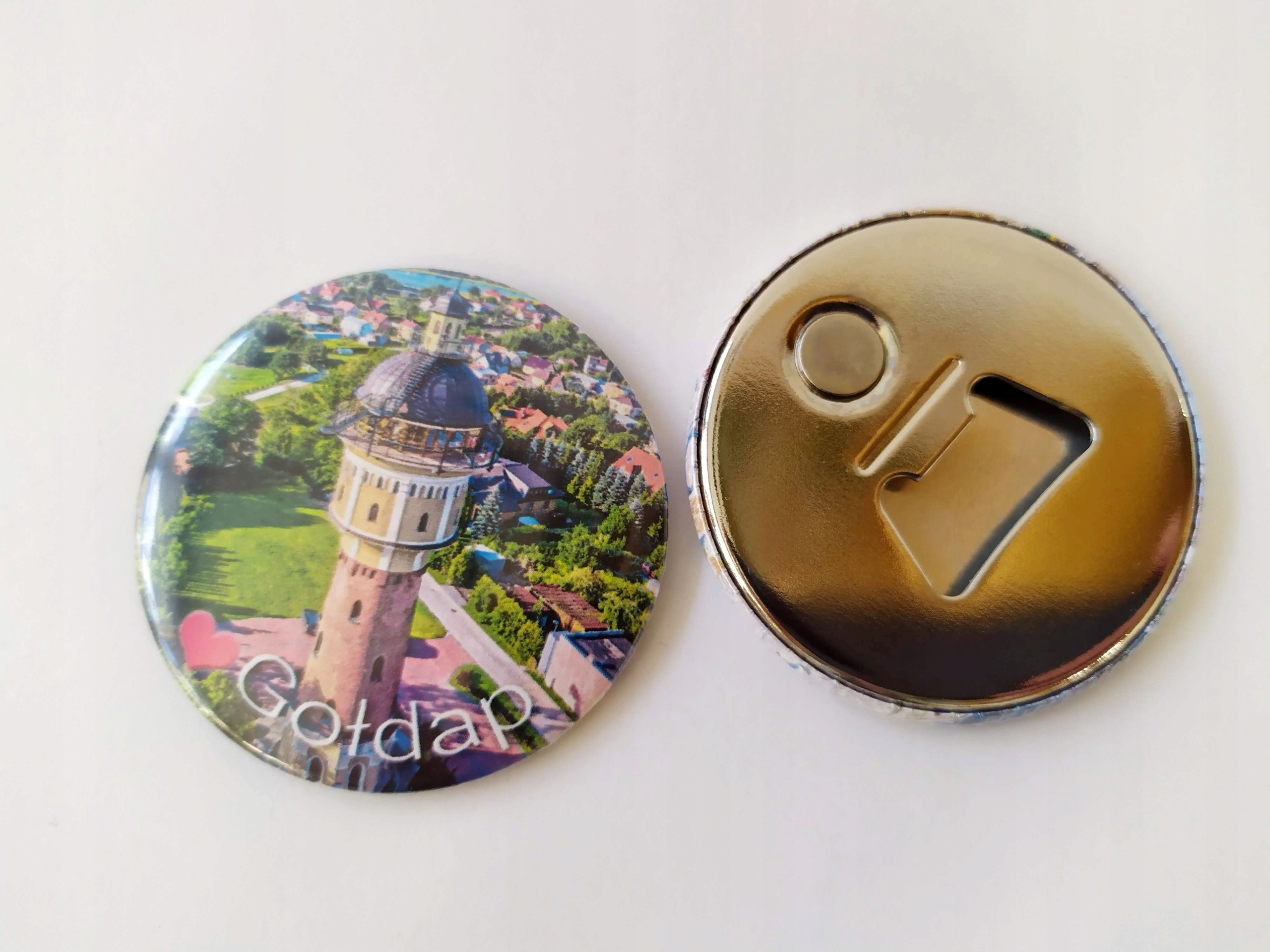 Pamiątkowy magnes na lodówkę z Mazur Garbatych, z powiatu gołdapskiego. Magnes okrągły z otwieraczem. Średnica 56 mm. Prosimy o podanie informacji o preferowanym wzorze lub załączymy losowy.