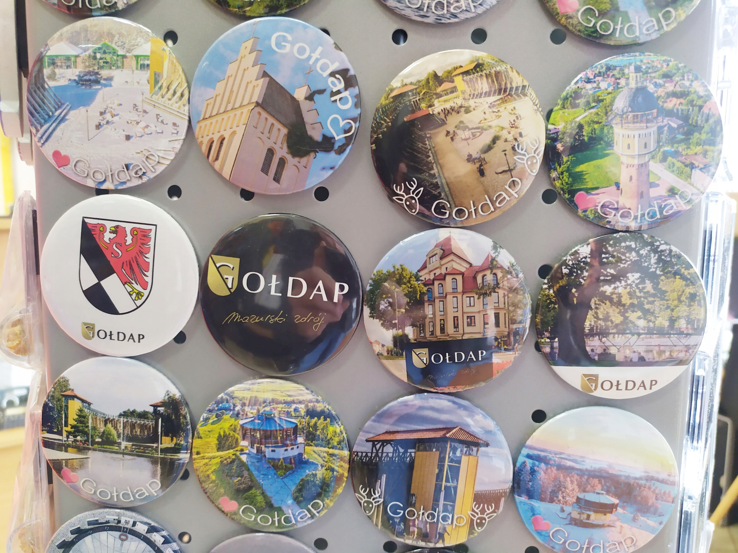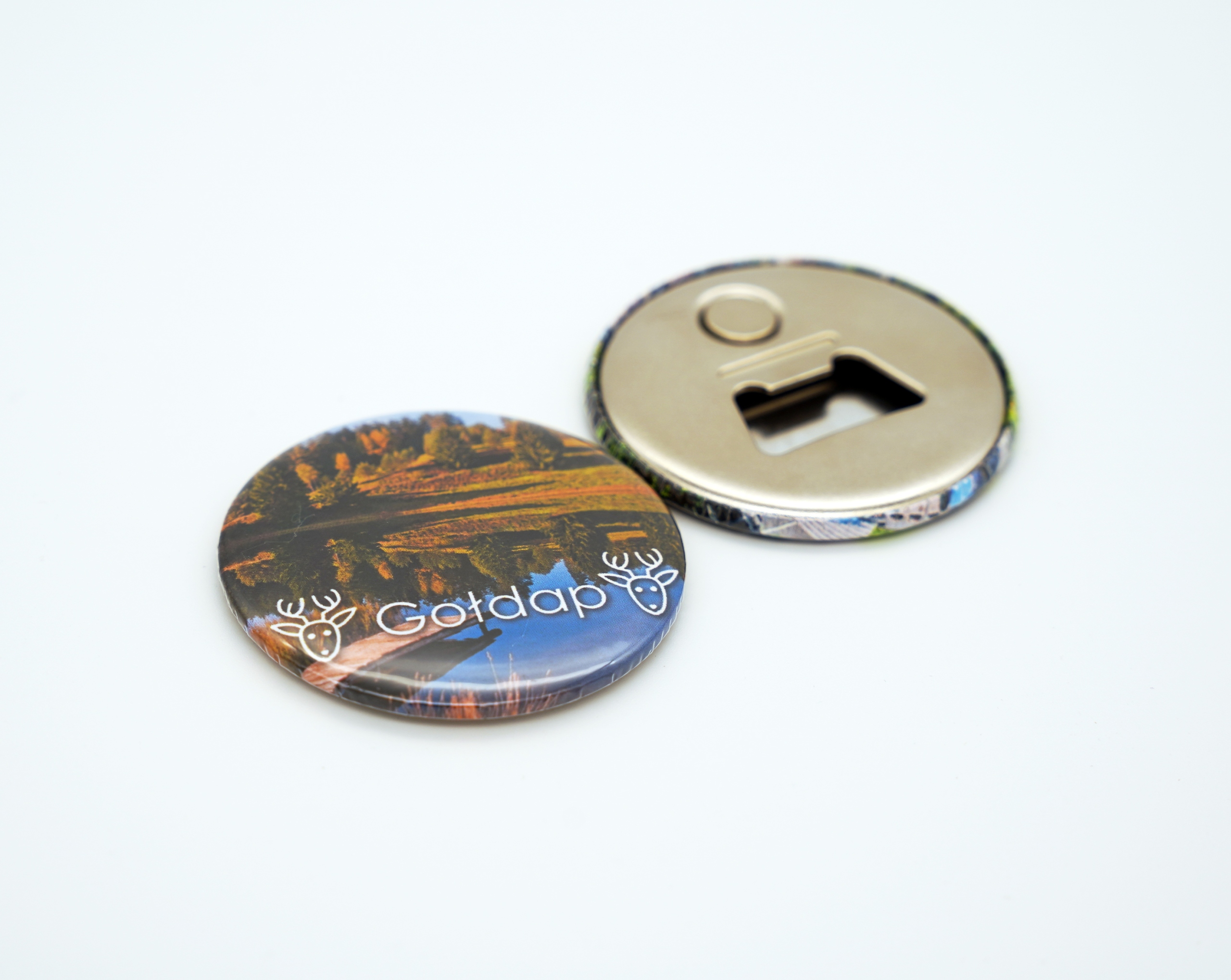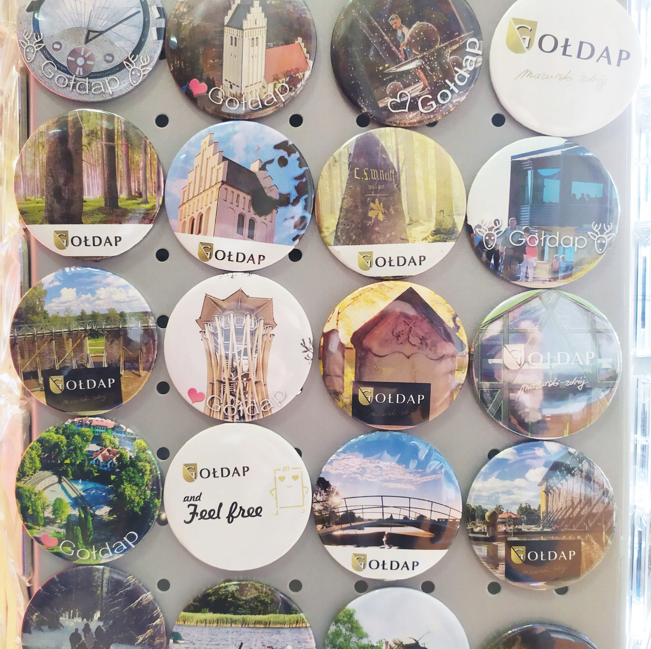 Pamiątkowy magnes na lodówkę z Mazur Garbatych, z powiatu gołdapskiego. Magnes okrągły z otwieraczem. Średnica 56 mm. Prosimy o podanie informacji o preferowanym wzorze lub załączymy losowy.