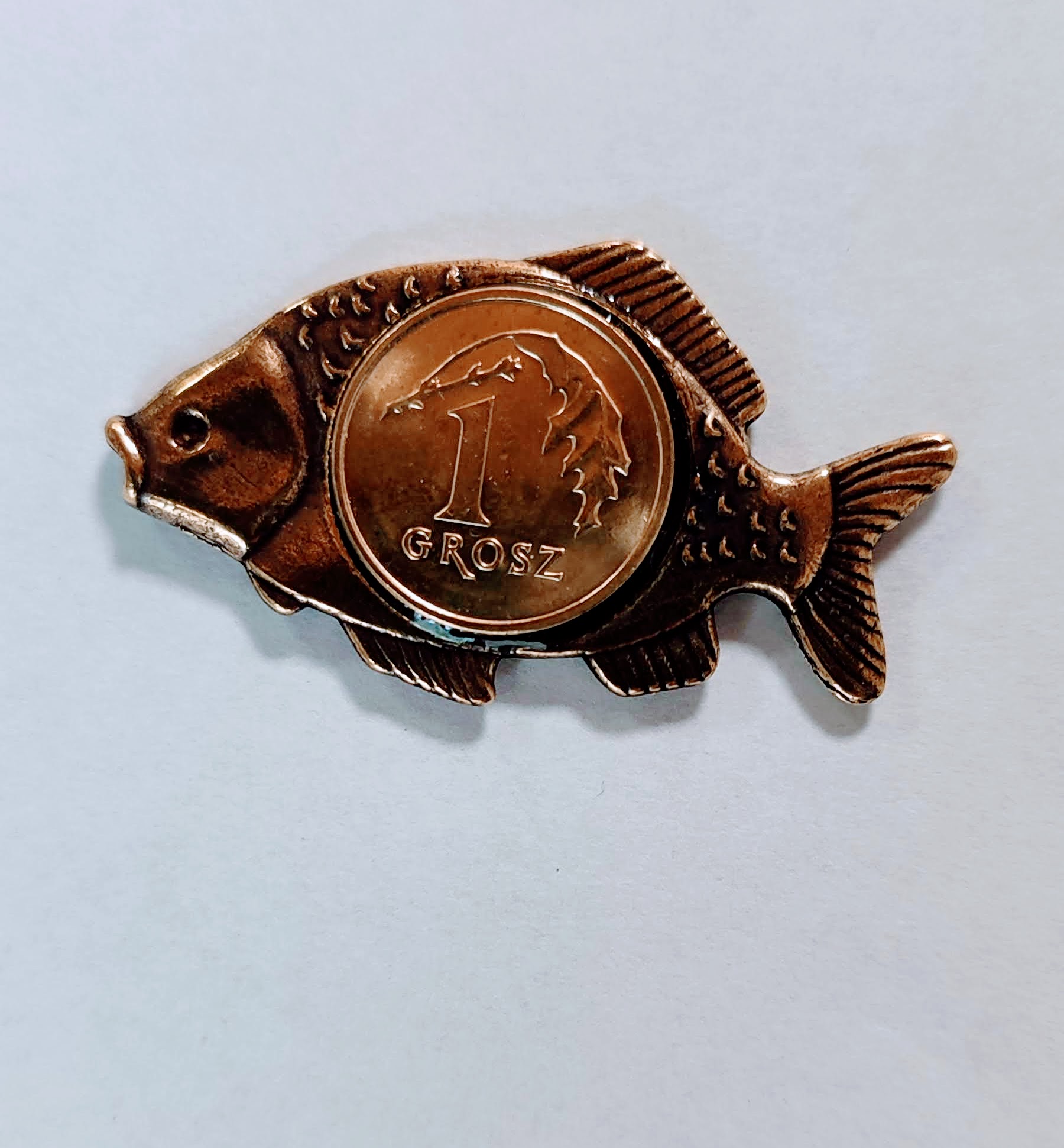 Ryba Karp z groszem trzymającą monetę 1 grosza